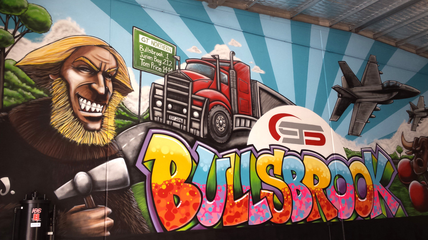 A mural I painted for Blackbook Ink at the STS Bridgestone Tyres place in Bullsbrook. The character on the left is the infamous bushranger Moondyne Joe. All done in MTN94.