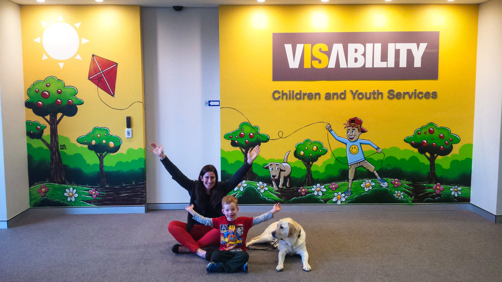 A mural I painted for Visability in Vic Park. Pictured is my son and his OT with a guide dog. Done in brushes and a bit of aerosol.